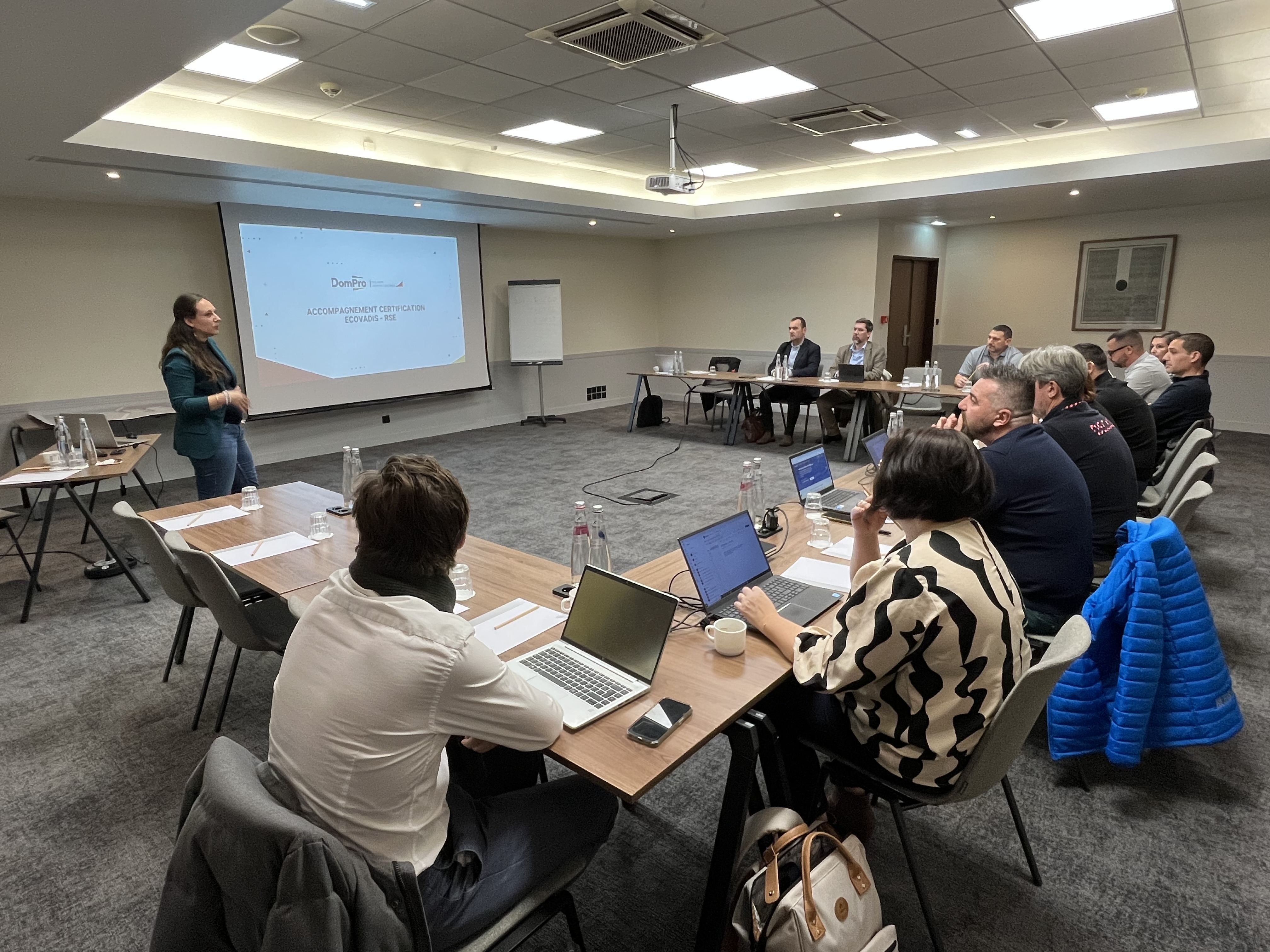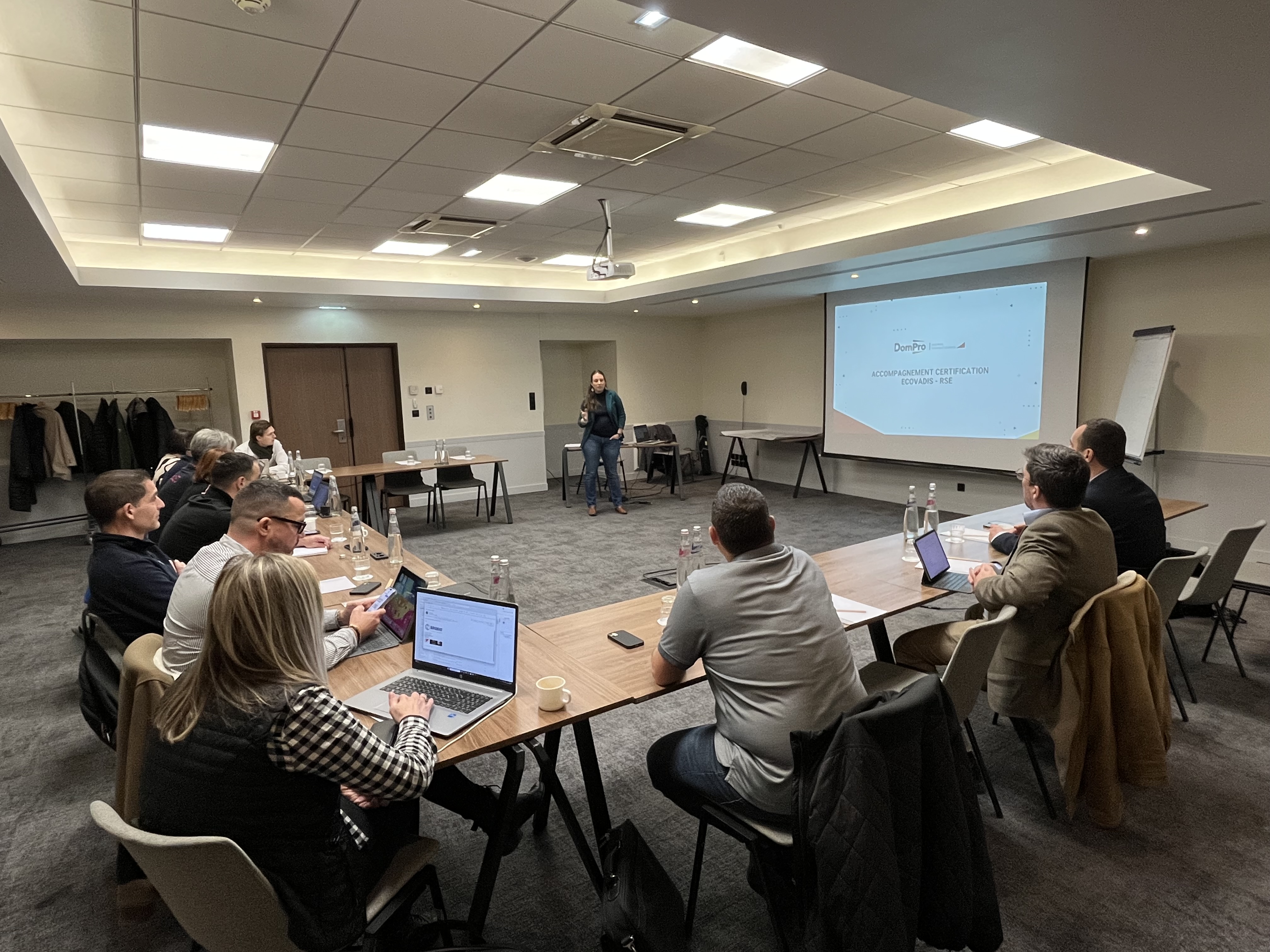 C’est pourquoi, DomPro les accompagne pour initier cette démarche et a proposé début décembre 2024 à des premiers adhérents pilotes, un premier atelier sur ce sujet. Cet atelier présentait la RSE et fournissait la méthode pour construire une démarche d’amélioration continue sur la RSE comme demandé dans ECOVADIS (une plateforme mondiale d’évaluation de la RSE). Une deuxième session aura lieu en mars pour aider ce premier groupe à avancer dans sa démarche avec une présentation de leur part des premières bases de leur démarche et un brainstorming d’outils à déployer pour continuer à avancer. En fonction des besoins, l’expérience de ce type d’atelier pourrait être renouvelée en 2025.
